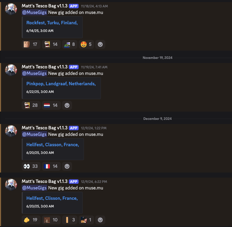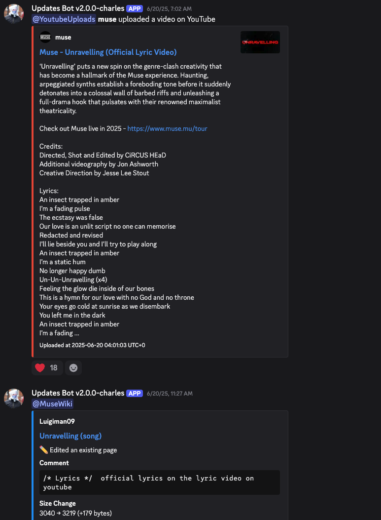 To keep in touch with my favorite music group Muse, I have developed a bot for biggest Muse Discord community, where data entry fetchers check various websites and social media accounts for any new entries. This results in finding out first about newest merchandise, new concerts or simply a YouTube upload. Updates are checked on one minute interval at fastest.