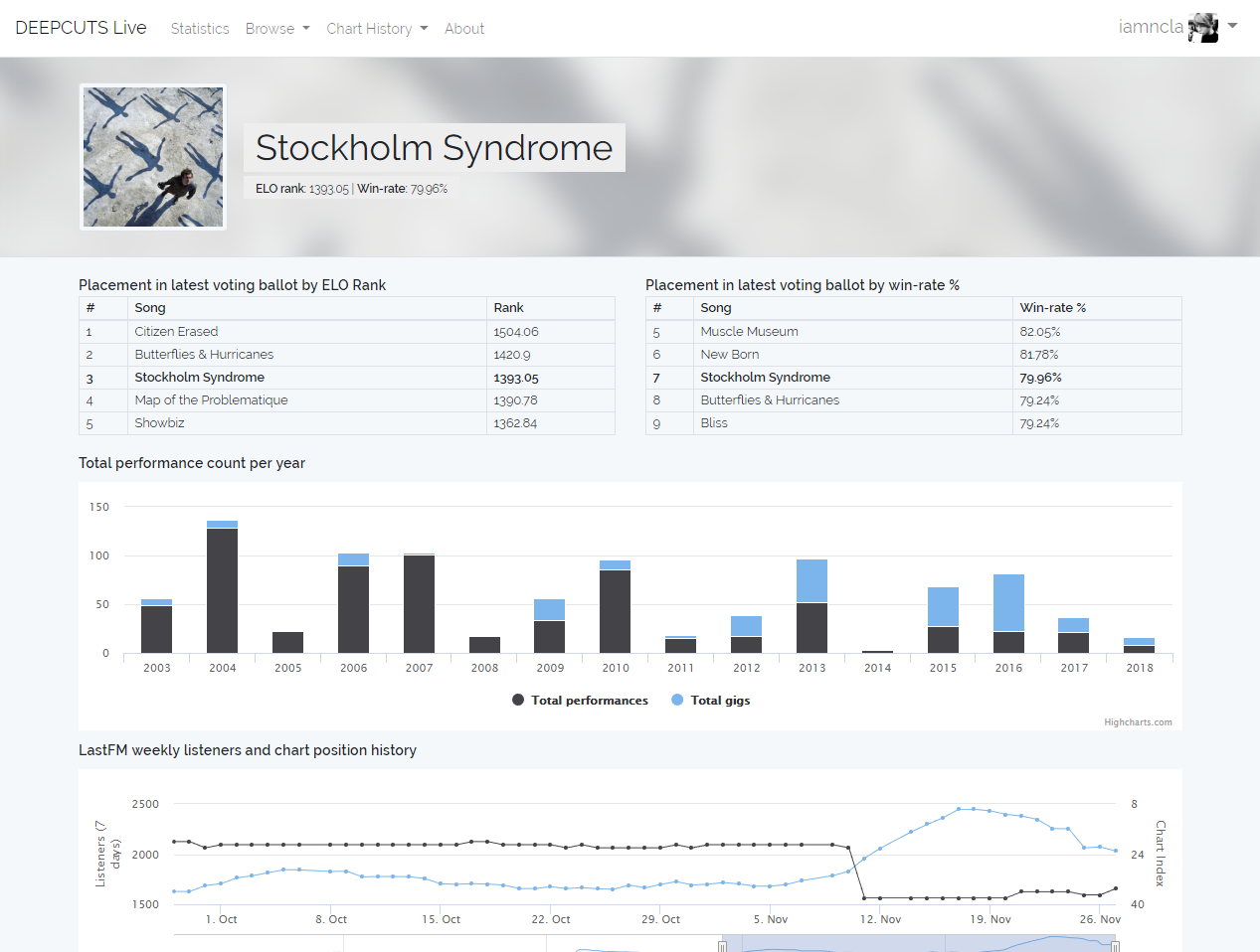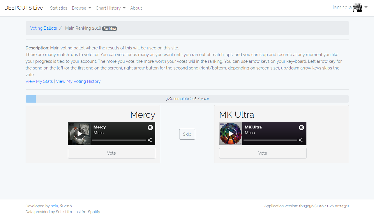 - Voting for song vs song match-ups. Votes are then used to calculate statistics and display them on site (ELO ranking, win rate percentage). Each vote is stored and tied to a user in database. All vote match-ups are distributed evenly.